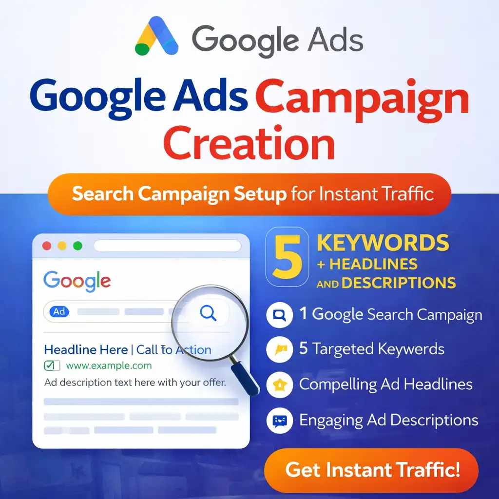 Google Ads Campaign Creation – Search Campaign Setup for Instant Traffic Get your website in front of customers instantly with a professionally set up Google Ads Search Campaign. Instead of waiting months for organic rankings, this service helps you appear directly in Google search results when people are actively searching for your product or service. I will create a high-converting search campaign designed to drive targeted traffic to your website. Every element is structured to maximize clicks, relevance, and performance while keeping your ads aligned with Google’s best practices. You’ll receive a fully configured campaign including: 1 Google Search Campaign setup 5-7 targeted keywords based on your niche Compelling ad headlines (optimized for clicks) Engaging ad descriptions (designed to convert) Proper campaign structure for better performance Running ads on Google is one of the fastest ways to generate traffic and leads. Your business will appear in front of users who are already searching for what you offer—meaning higher intent, better quality traffic, and more opportunities to convert visitors into customers. How this service works: 1. Provide your website URL 2. Provide your target location (country/city) 3. (Optional) Share your main keywords or services Once submitted, I’ll handle the full campaign setup so you can start attracting traffic right away.